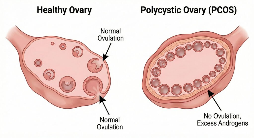 - Polycystic Ovary Syndrome (PCOS): A common hormonal disorder where the ovaries produce excess male hormones (androgens). This prevents the ovaries from releasing an egg every month, leading to missed periods, weight gain, and excess hair growth.
